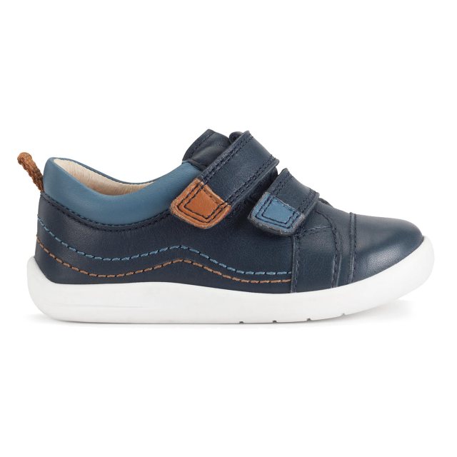 A clubhouse classic that goes stylishly back in time – in soft navy leather with decorative stitching. Breathable leather linings, padded ankle support and cushioned insoles give little feet instant lasting comfort as they wear them. There is also a flexible and lightweight sole for easy, natural movement. Removeable footbed and child-friendly double riptape fastenings achieve a secure fit. Part of the fourth collection in the popular collaboration, combining Start-Rite's trusted silhouettes with JoJo Maman Bebe's endearing characters and signature prints.