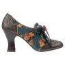 Louis heeled brogue style DAISY is in a vintage class of its own. Pretty floral print wool is teamed with mock-snake and finished with a quirky butterfly shaped appliqué to set off the rich satin laces. A warm ochre underlay peeps through the punch detailing. This style has stacked leather heels. DAISY matches perfectly to Ruby Shoo bag style BELFAST and purse style ONTARIO