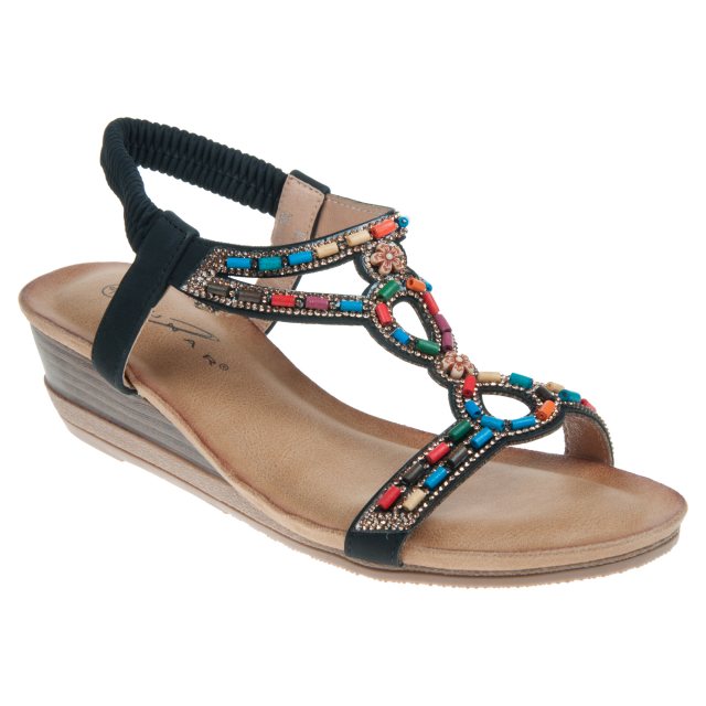 Upgrade your summer style with the Epsom black sandal. Crafted from faux leather with a comfy padded insole, these sandals feature an elasticated ankle strap for the perfect fit. The colourful beading detail on the upper straps adds a playful and vibrant touch, making every step a stylish statement.
