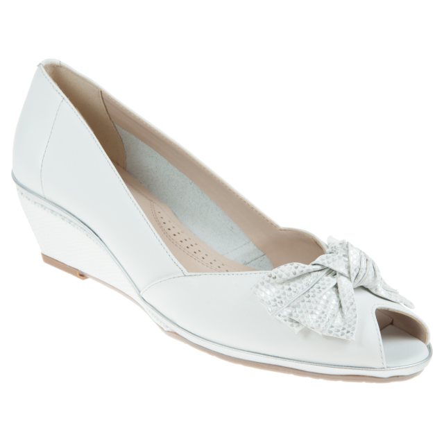 Florida II are a classic Van Dal peep toe wedge, crafted from super soft white leather. Florida II features a decorative knotted bow trim and an ultra wearable 45mm wedge heel. A great summer shoe for all day wear.