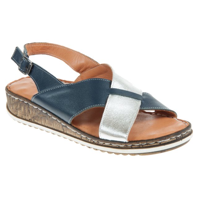 Meet the Grenoble navy sandal, a stylish addition to your summer footwear collection. Crafted with a leather upper and leather lining, this sandal features a leather insole for extra comfort. The adjustable ankle strap with buckle fastening ensures a secure fit, while the overlapping two-tone upper straps in navy and silver add a touch of elegance. The low wedge provides just the right amount of lift for all-day wear. Perfect for any occasion, the Grenoble navy sandal is a must-have.