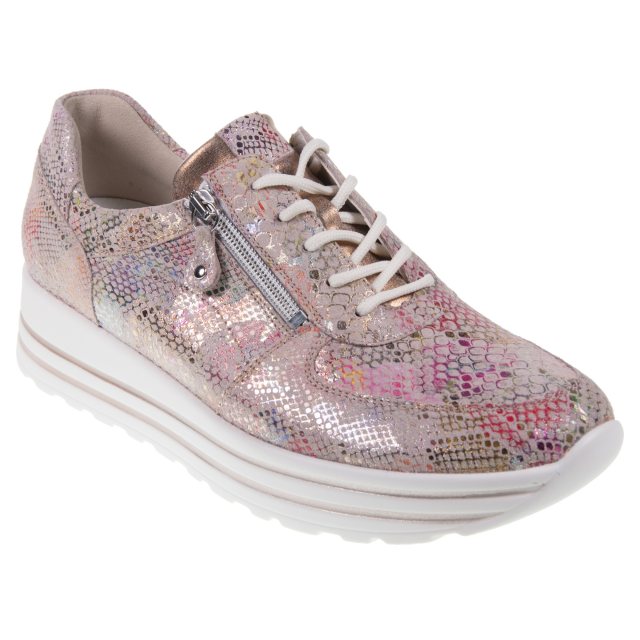 Ladies rose light gold lace up sneaker shoe. This shoe is ideal for those who need a wider fit or wear orthotics due to the removable insole.