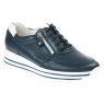 Ladies navy and white lace up sneaker shoe. This shoe is ideal for those who need a wider fit or wear orthotics due to the removable insole.