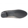 Beautiful low heeled court shoe with patent toe cap and heel and constrating metallic patterned sides.