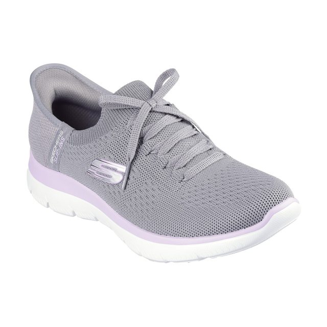 Pick up the pace with increased ease-of-wear and platinum comfort wearing Skechers Hands Free Slip-ins®: Summits - New Daily. Designed with our exclusive Heel Pillow™, this vegan style features a Stretch Fit® engineered knit upper with fixed laces, metallic midsole trim and a cushioned Skechers Air-Cooled Memory Foam® comfort insole.