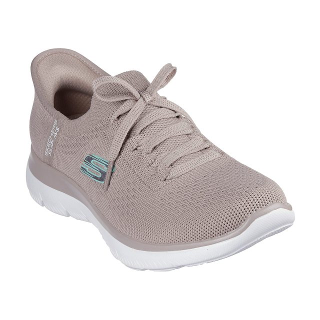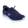 Pick up the pace with increased ease-of-wear and platinum comfort wearing Skechers Hands Free Slip-ins®: Summits - New Daily. Designed with our exclusive Heel Pillow™, this vegan style features a Stretch Fit® engineered knit upper with fixed laces, metallic midsole trim and a cushioned Skechers Air-Cooled Memory Foam® comfort insole.