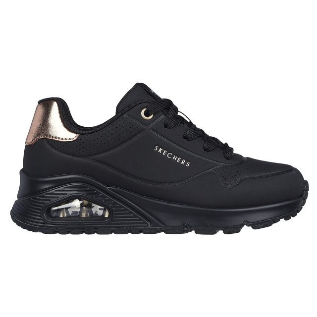 Level up your sneaker game with cushioned comfort wearing Skechers Street™ Uno Gen1 - Shimmer Away. This lace-up fashion sneaker features an synthetic duraleather upper with a metallic trim, Skechers Air-Cooled Memory Foam® comfort insole and a visible Skech-Air® airbag midsole.